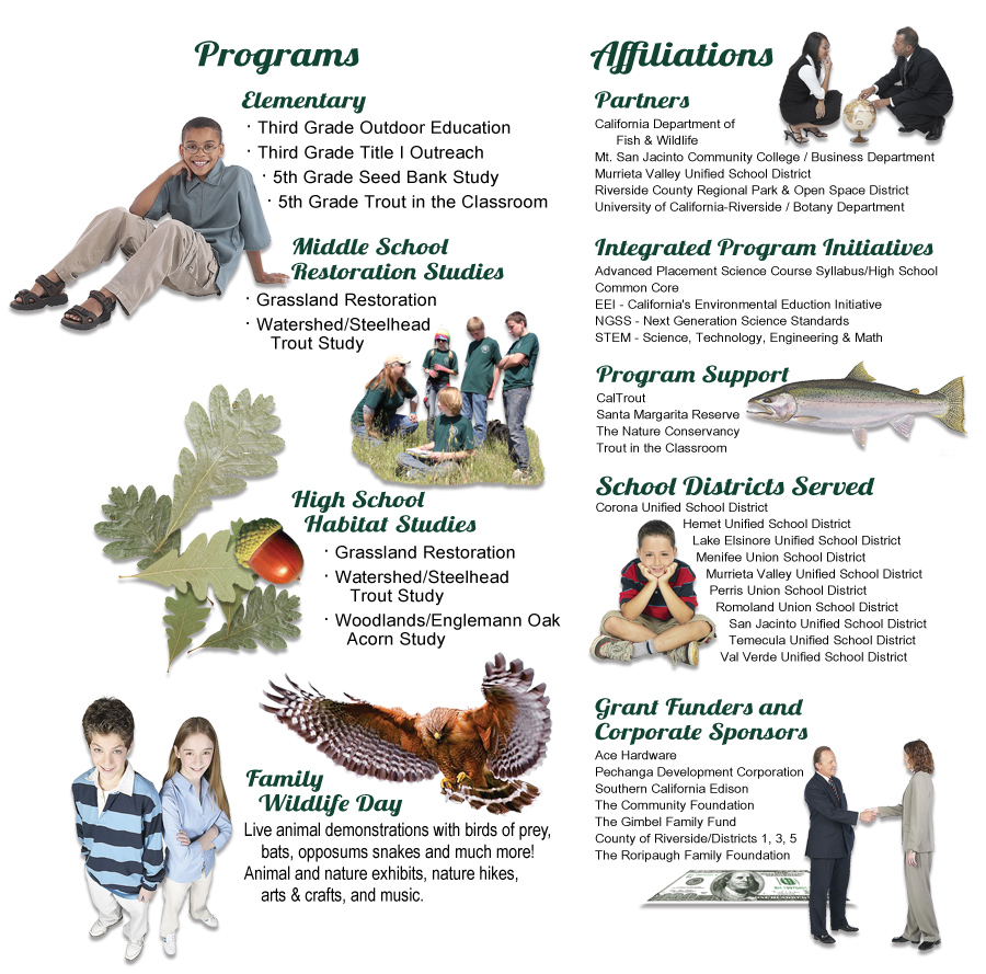 TNEF is currently conducting an Environmental Education Pathway (EEP) pilot project, now beginning its 7th year, in Murrieta Valley Unified School District, one of the ten school districts served by TNEF. EEP involves progressively more exciting and advanced nature activities and studies beginning with the Third Grade Outdoor Education Field Trip / Third Grade Outreach programs and continuing through 12th grade.